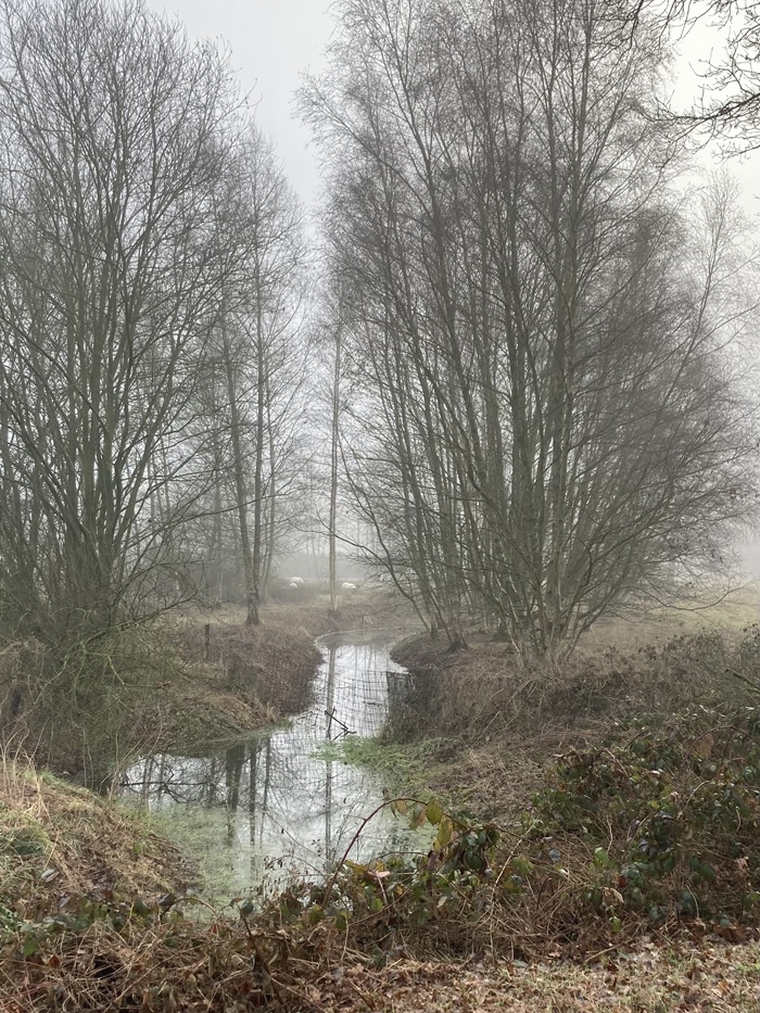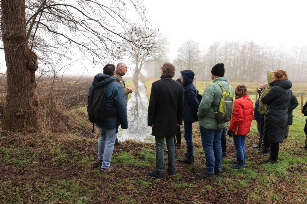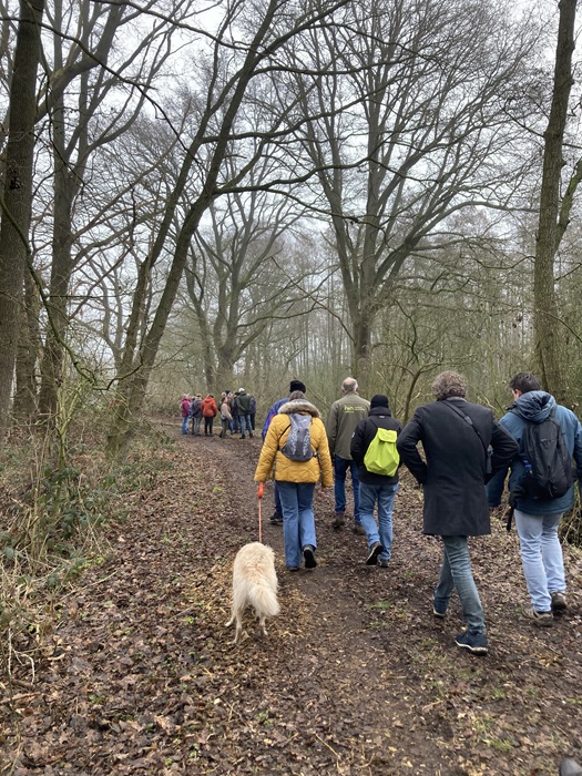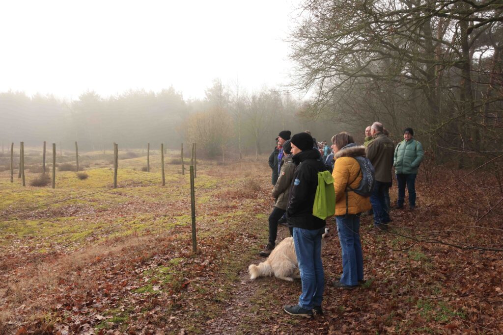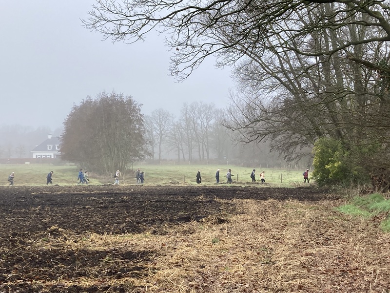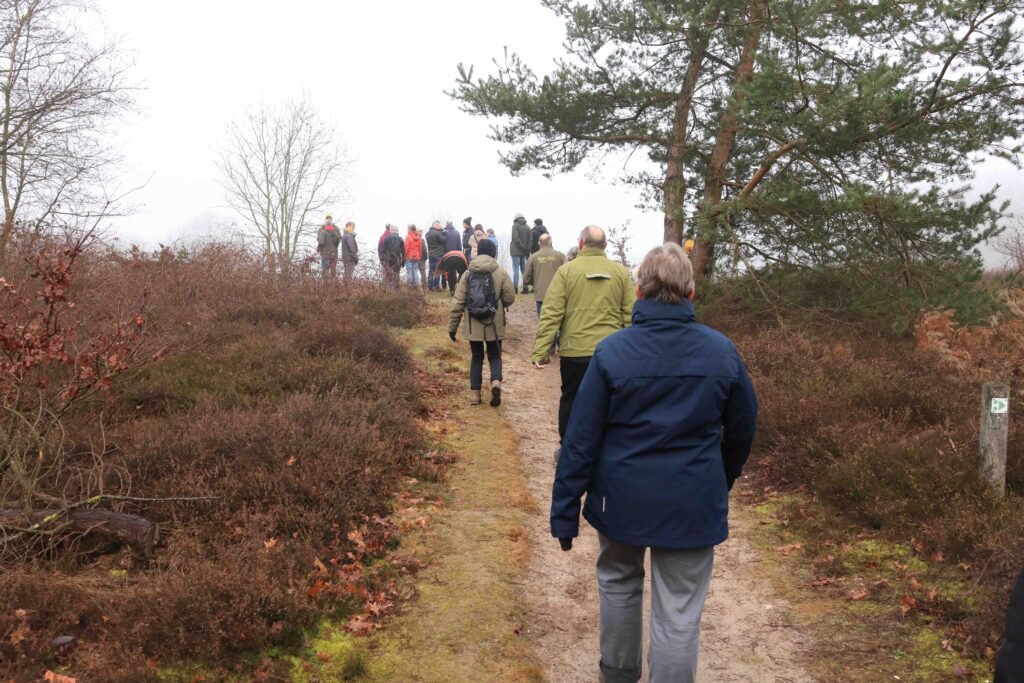 De nieuwe lange wandeling langs de buurtschappen Loo, Bus en Menzel stond als een van de eerste op het jaarprogramma 2026, maar werd geannuleerd omdat het op die dag alleen met langlaufski’s mogelijk zou zijn geweest. Uitstel dus en een nieuwe datum zoeken. Dat werd afgelopen zondag, 8 februari. Door veel reeds gevulde agenda’s met daarbij nog wat fysiek ongemak leidde dat tot een nieuwe bezetting natuurgidsen. Zo arriveerden drie bereid gevonden IVN-ers op een koude en wat mistige zondagochtend bij vertrekpunt Natuurcentrum Slabroek. Niet bepaald uitnodigend weer maar gelukkig stonden er al drie liefhebbers te wachten zodat er voor ieder van ons tenminste ‘werk was’. Ik was duidelijk te pessimistisch geweest, want toen we om 09.00 uur vertrokken waren er zestig wandel enthousiastelingen!!!