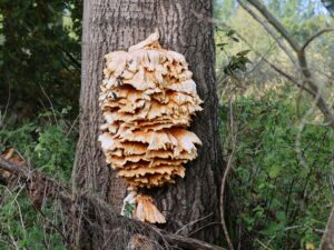 In de natte, lage delen van het gebied is een bewust maaibeleid: sommige stukken worden niet gemaaid, zodat planten en insecten meer ruimte krijgen. We zagen ook tal van zwammen, waaronder een opvallend oranje zwavelzwam op een dode boom, een echte blikvanger.