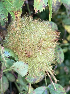Over de zonovergoten boulevard wandelen we rustig terug naar de Wijde Wereld. We staan nog even stil bij de tamme kastanje en zien door de loep massa’s meeldraden die ervoor zorgen dat het asfalt bruin ziet van het stuifmeel. Links van het pad ligt de langgerekte wadi die het park begrenst. Hier wordt het regenwater uit de aangrenzende wijk opgevangen zodat het kan infiltreren in de grond. Vlak voor het einde van de excursie spotten we nog twee grote rozenmosgallen op de takken van een hondsroos.