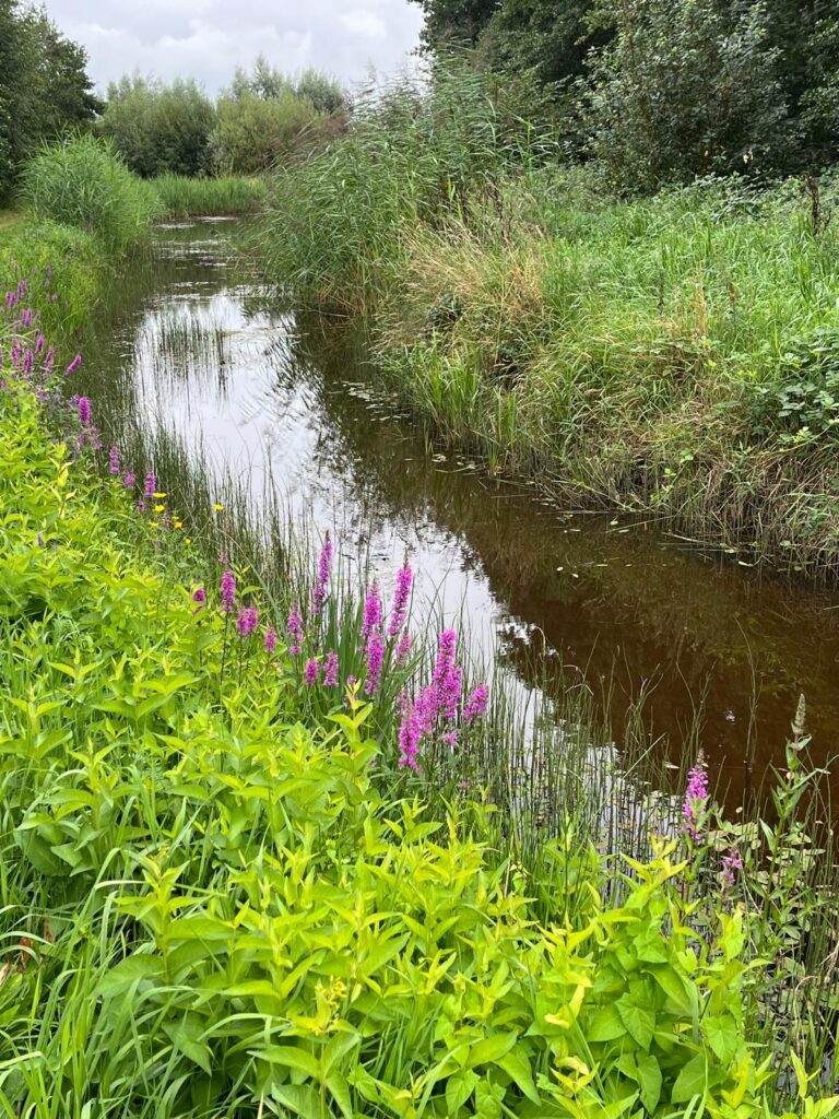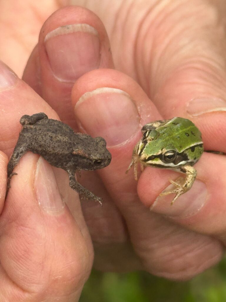 Na een toelichting van Siebe over zijn bedrijfsvoering, togen vier groepen deelnemers het gebied achter de boerderij in. Een mooie route via de bloemrijke graslanden, naar de ecologische verbindingszone Leijgraaf. Door een gevarieerde inrichting met flauwe oevers, kruidenrijk grasland en bosjes is hier een keur aan planten en dieren te zien. Naast veel algemene soorten ook waterweegbree, stijf ogentroost, hazenpootje, zandblauwtje, fonteinkruid en heelblaadjes. De groene en bruine kikker werden allebei aangetroffen waardoor diersporenexpert Annemarie van Diepenbeek mooi de verschillen kon uitleggen.