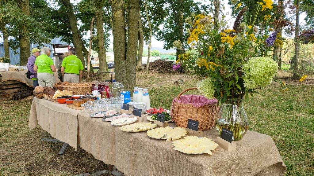 Kunstenaar Teun gaf een toelichting op de bijzondere picknickbank die op de ontbijtlocatie was geplaatst. Deze heeft hij samen met zijn vader Jan van Doren gemaakt en is een resultaat van een kunstproject waarbij schoolkinderen dichtregels mochten maken over het water in het Aa-dal. Bedoeling was een tafel die inspireert tot nadenken over water. De teksten die de kinderen aanleverden, zijn verwerkt in een grote picknickbank die is gemaakt van hout dat uit oude schuren van Siebe’s Kaas is gekomen. Een mooie combinatie van duurzaamheid, circulariteit en educatie.