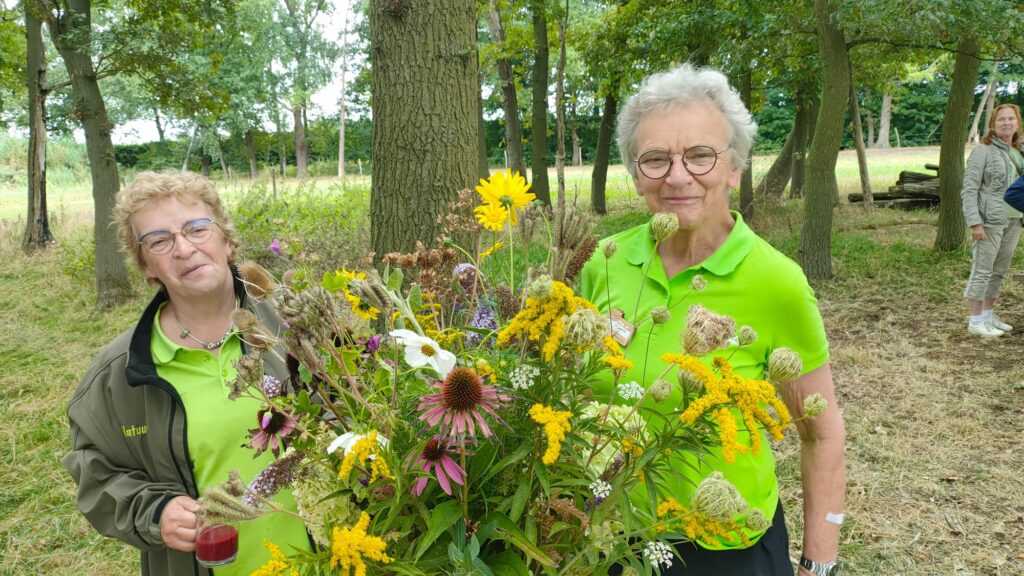 Dit jaar waren we te gast bij Siebe’s Kaas, Kraanmeer 15 in Erp, onderdeel van Zuivelboerderij de Leijgraaf. Een prachtige natuurinclusieve rundveehouderij die werkt met speerpunten als beweiding, klavers, natuur inclusieve vruchtwisseling met granen en zonnebloemen en heel veel kruidenrijk grasland. Dat kruidenrijk grasland was prachtig te zien tijdens de wandelexcursie die de deelnemers konden maken onder leiding van onze gidsen. Rode en witte klavers, cichorei en streepzaad kleuren de weilanden.