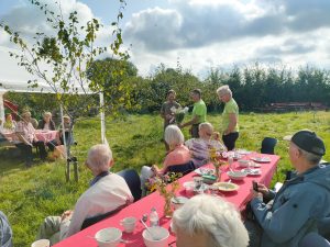 Daarna de wandeling. De groep werd in vier groepjes verdeeld. Het was een wandeling door een gevarieerd landschap. We startten op het boerenland, vervolgens door het beekdal en terug over de stuifduinen. Voor één groepje was de afstand en het tempo aangepast. Dit werd erg gewaardeerd! Terwijl de groepen wandelden, werd de afwas gedaan door een geweldig afwasteam, dat dit al jaren doet. En tevens alles opgeruimd, zodat we voor de middag buien klaar waren en dat is gelukt!! Al met al een zeer geslaagde dag.