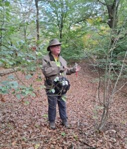 Op deze bewolkte zondagmorgen staat er een groep van 45 deelnemers paraat om mee te lopen met de paddenstoelenexcursie van IVN Uden e.o. De groep wordt verdeeld over de vijf gidsen. Petra neemt de kinderen mee; Paul, Saskia, Ingrid en Paul gidsen de volwassenen. De deelnemers zijn heel geïnteresseerd en stellen ook veel vragen. Ik had als coördinator twee weken geleden al een regendansje gedaan. Het weer was precies goed. Vorig weekend regen en vandaag droog. Dus ideaal voor de paddenstoelen en de deelnemers.