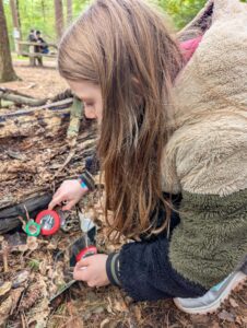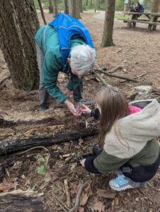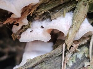 We gaan ook op zoek naar de kleintjes, en ja hoor, de paardenhaartaailing op een dennennaald wordt gevonden. Ook de witte paardenhaartaailing op het blad van de Amerikaanse eik is net zo klein. Het muizenstaartzwammetje op de dennenappels is iets groter. De gidsen geven uitleg over de voortplanting, de functie van de paddenstoelen, welke vrienden zijn, vijanden of vuilnismannen. Na ongeveer 2,5 uur gaan de deelnemers tevreden en een stukje wijzer naar huis.