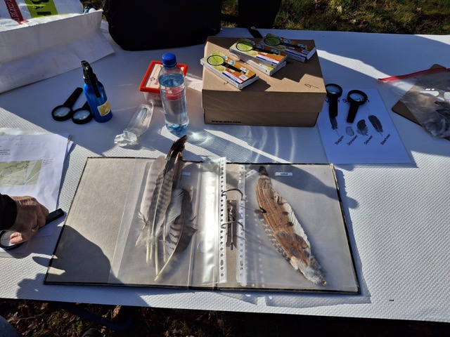 Tijd voor het echte werk, we gaan op pad. In vijf groepen lopen we de geplande route. Er komen allerlei dingen voorbij die met vogels te maken hebben. Wat kan een vogel allemaal met zijn snavel? Gevolgd door een spel waarbij de kinderen moeten raden welk voedsel hoort bij welke vogel. We luisteren naar vogelgeluiden van o.a. ekster, merel, houtduif en koolmees. De kinderen wisten al goed te raden welke vogels er bij die geluiden horen. Alleen de groene specht was nog wat lastig. Uiteraard bekijken we vele soorten veren en de kinderen mochten zelf testen of vogelveren water afstoten. Met een loep konden ze zien hoe mooi die veren zijn. Donsveren werden opeens wat gewoner toen ze hoorden dat ze er misschien wel elke avond onder kruipen als ze hun dekbed over zich heen trekken. De rui komt uitgebreid aan bod en ook waarom vogels moeten ruien. Bij een andere stop staan op een bankje allerlei eieren uitgestald: van eenden, kalkoen, kippen en zelfs van een struisvogel. Ook zijn er wat nestjes te zien van het voorgaande jaar, zoals eentje van een kleine karekiet. Toch knap, dat zo’n vogeltje met alleen zijn snavel zo’n mooi nestje kan bouwen en het ook nog zo stevig op kan hangen tussen de stengels. Hans heeft ook wat net uitgebroede kippeneieren meegenomen. Het is goed te zien hoe de kuikentjes de schaal opengepikt hebben. Zelfs de navelstreng is nog te zien. De kinderen en hun ouders vinden het allemaal prachtig.
