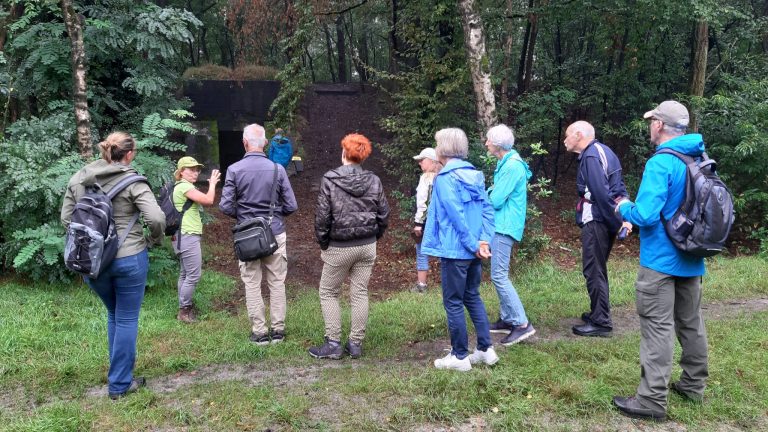 In de Trentse bossen stonden we stil bij de commandobunker nummer 221. Die stamt uit de tijd van de Koude Oorlog en is nu in gebruik is als vleermuisbunker. Ook zagen we de bomkrater die is ontstaan door de bombardementen door de geallieerden tijdens de Tweede Wereldoorlog. Aan het Duits lijntje hebben we gesproken over de historie van deze eerste internationale treinverbinding van Nederland, die ca. 100 km lang was, en 100 jaar in Uden heeft gelegen. De wachtpost en het mariniersperron waren onderdeel van de route, waarna we via het Achteroventje terugliepen. Daar passeerden we een herdenkingsmonument voor vier omgekomen Engelse vliegers die operatie Market Garden niet hebben overleefd.