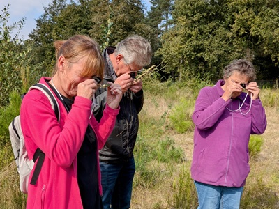 Op zondag 15 september hebben zich om tien uur, naast de gidsen Mark, Corry, Adriëtte en ikzelf, bij Eeterij D’n Oven in Zeeland negentien deelnemers gemeld voor de wandeling. In groepjes van vijf starten we de wandeling richting Achter Oventje om het zandpad langs de minicamping in te slaan. Langs de minicamping is in het voorjaar het Mosbloempje, Crassula tillaea, te vinden. Dit is een klein plantje, rood verkleurend met witte bloempjes en eenjarig, dat op de rode lijst staat. Op dit moment is er al niks meer van terug te vinden.