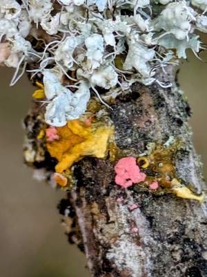 Uit de Trentse bossen gekomen steken we de Millsebaan over en struinen we over een aangelegde verbindingszone richting het Duits Lijntje. Hier vinden we op een tak het groot dooiermos, kapjesvingermos en het rode lipstickmos (illosporiopsis christiansenii). Dit zijn allemaal korstmossen, evenals het klein leermos iets verderop. We hebben nog even aandacht voor de gallen op de eikenboom, de satijnen knoopjesgal, plaatjesgal, stuitergal, galappel.