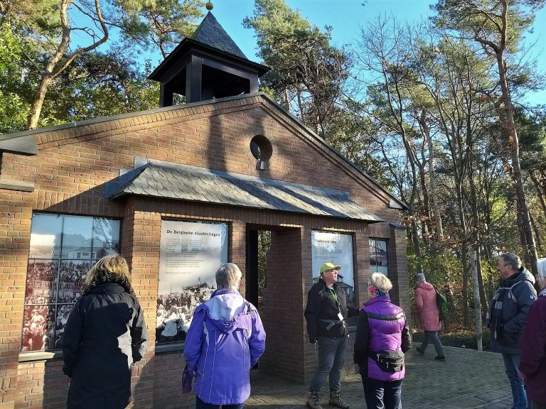 Bij het voorwandelen lazen we al alle informatieborden die er langs de route staan. Met foto’s, teksten en plattegronden geven deze een goed inzicht in ontstaan, verwezenlijking en gebruik van deze opvanglocatie voor Belgische vluchtelingen, Vluchtoord Uden. En voordat dit gebouwd was (in drie maanden tijd gerealiseerd!) was er al sprake van vluchtelingen die op straat moesten overnachten, en provincies die verplicht werden vluchtelingen op te nemen en te verdelen over gemeentes. Klinkt bekend!