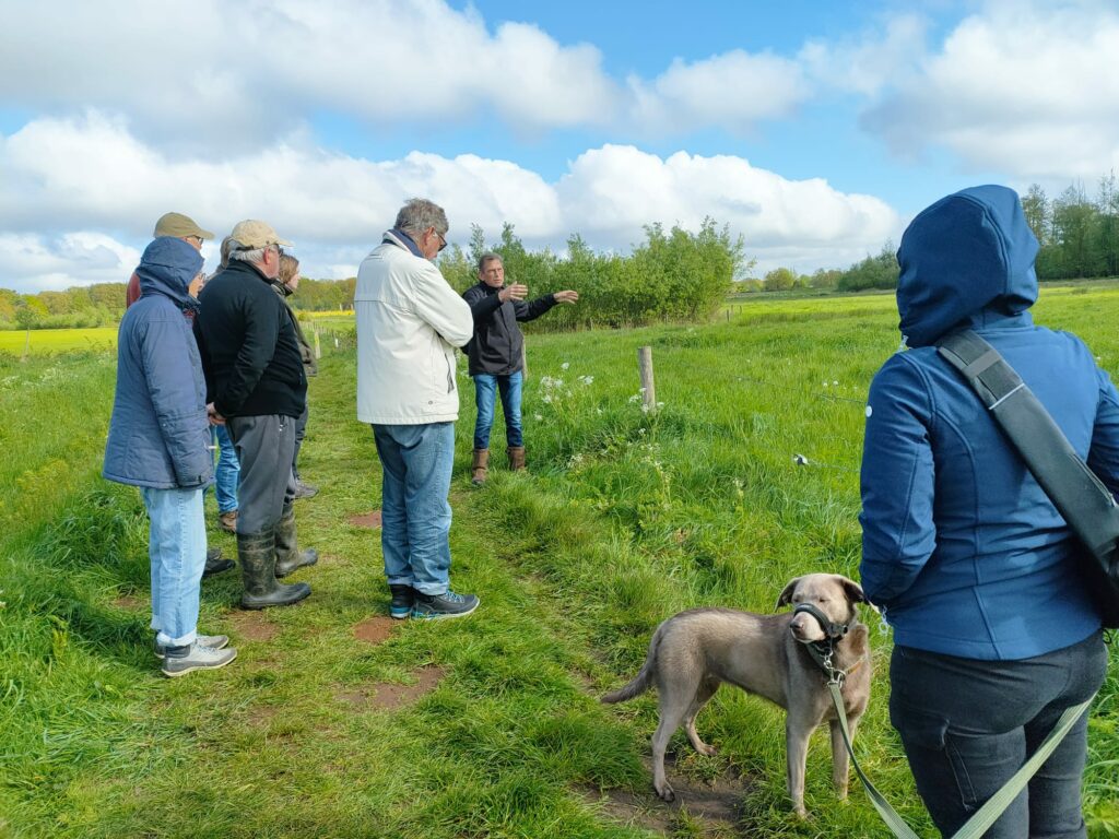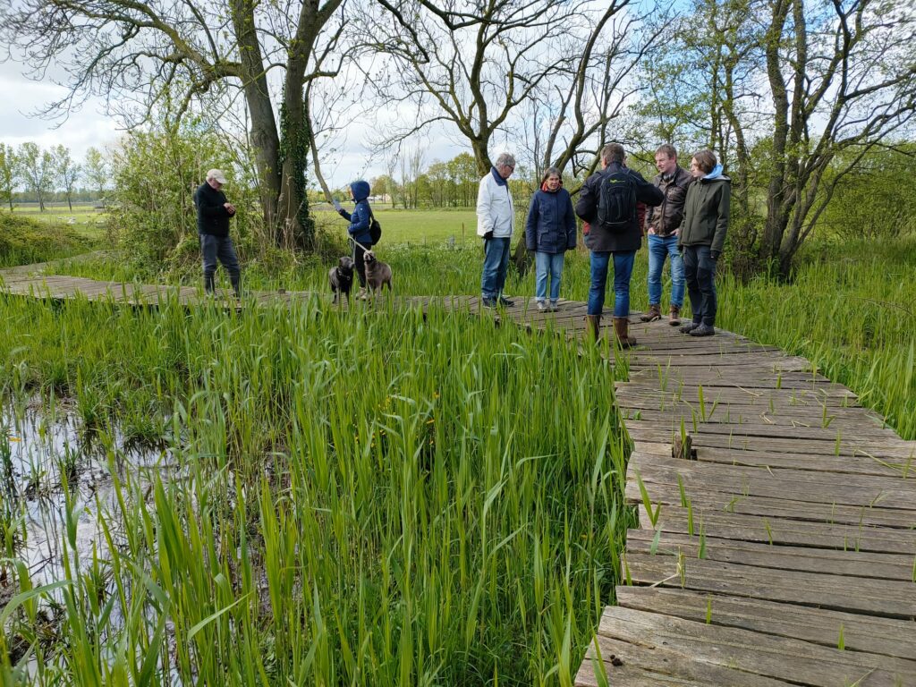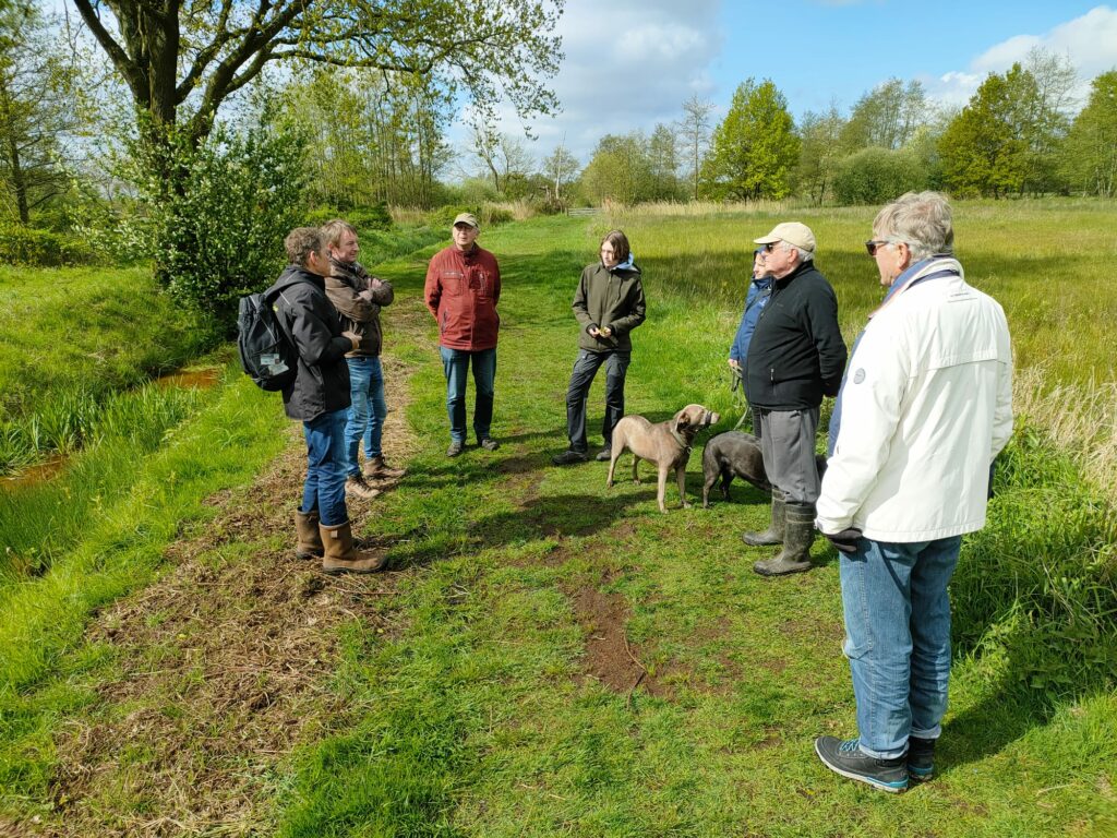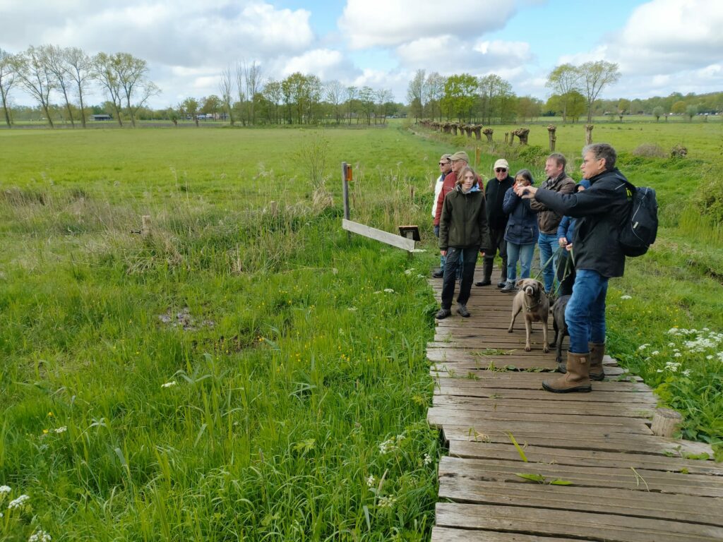 Toen we het poortje en de beplanting aan de achterkant van het parkeerterrein aan de Schansweg gepasseerd waren werden we onaangenaam verrast door de oranje aanblik van een flink deel van het weiland dat duidelijk met Roundup bespoten was. Het verschil van deze nog intensief beheerde grond met de wat verder gelegen extensief beheerde percelen hoefde amper meer uitgelegd te worden. Dood versus biodiversiteit. Gelukkig was er aan de linker zijde nog wel wat bijzonders te zien aan de nog net bloeiende wilgen: volop wilgenroosjes, gevolg van galmugjes. De larven zijn intussen verpopt en uitgevlogen maar de bruine ‘roosjes’ waren goed te zien tussen het jonge wilgengroen. Op weg naar de knuppelbrug zagen we nog een fraaie zadelzwam op een van de knotwilgen. De uitgestippelde wandeling leende zich mooi om uitleg te geven over de verschillende manieren om bij overgang van landbouwgrond naar natuur de grond naar de gewenste voedselarme staat te brengen. Afgraven en afvoeren (zoals bij de percelen langs de Steeuwichtweg) of, het langduriger maaien en afvoeren (percelen langs Beemdenweg en Hogeburchtweg). Via mooie zandpaadjes daarna weer terug richting Aardkundig Monument en vandaar naar het eindpunt. Bij het passeren van de Schotenweg bleek die behoorlijk kapot gereden waardoor de laarzen nog een laatste keer getest konden worden. Het was een mooi actief begin van de zondag en de deelnemers gingen rond half een tevreden naar huis.