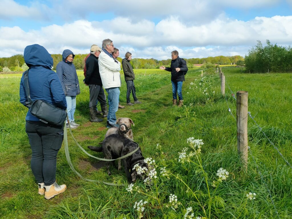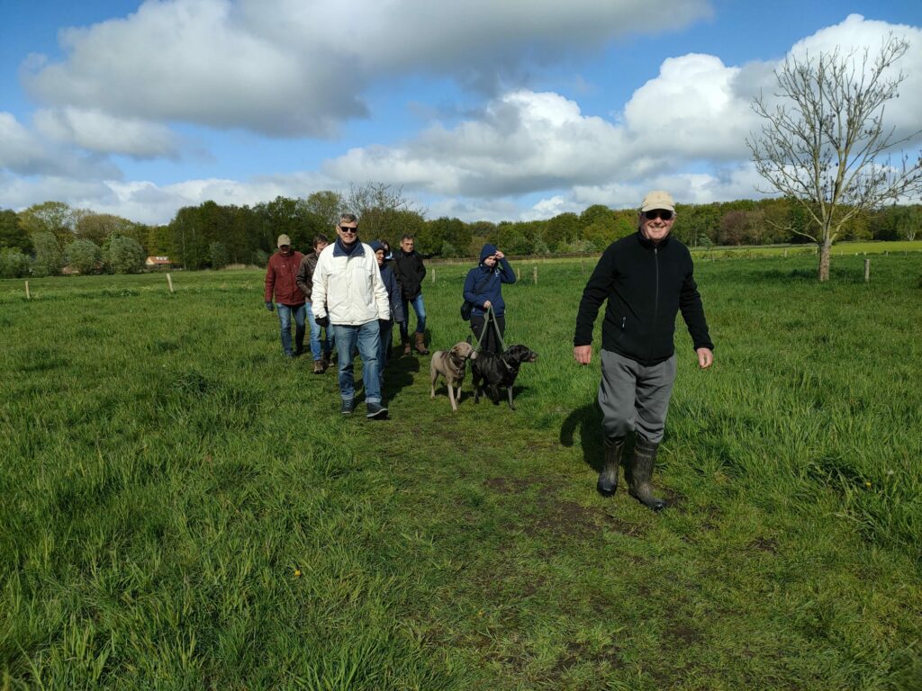 Terwijl de temperatuur al wekenlang onder de normale waarden voor april bleef en ook de frequente buien niet echt uitnodigend waren om eens lekker een paar uur te gaan wandelen (we vingen bij het voorwandelen op zaterdag zowel wat regen als wat hagel) meldden zich op zondag 21 april toch zo’n veertig mensen voor een tocht van zo’n tweeëneenhalf uur over de prachtige Udense wijstgronden. De meeste mensen hadden al bedacht dat laarzen geen overbodige luxe waren. Met zes gidsen konden we mooi kleine groepen maken waarbij elke deelnemer zijn vragen en opmerkingen gemakkelijk kwijt kon.
