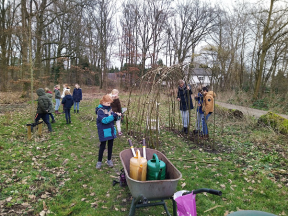 Met een grondboor, schoppen, takkenschaar, aardappelschilmesjes, touw, gieters vol water en een heleboel enthousiasme hebben we op woensdag 2 februari voorlopig de laatste voorbereidingen aan ons wilgentunneltje gedaan. We hebben een aantal extra bogen gemaakt, en de bogen met wilgentakken aan elkaar gevlochten. Nu zijn we heel benieuwd wat de natuur ervan gaat maken. Waar we ook benieuwd naar zijn is of de twee dikke wilgentakken die we in de grond geplant hebben gaan uitlopen tot nieuwe knotwilgen. De meeste kinderen konden het zich nog niet helemaal voorstellen, maar toen we er een weddenschap van maakten bleken de meesten toch te verwachten dat er over een tijdje twee extra bomen staan.