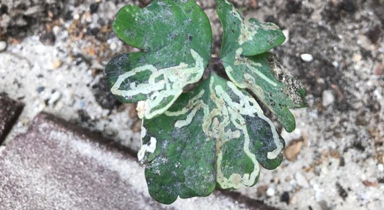 Dat werd nog eens duidelijk zichtbaar toen een familielid mij opmerkzaam maakte op een vreemd verschijnsel op bladeren van net een aantal dagen geleden vers gekochte en geplante akeleien. Er waren diverse lichte kronkelstrepen zichtbaar op de bovenzijde van het blad. Onregelmatig en ongelijk van vorm en breedte. Soms was er een begin en een eind zichtbaar dat smaller of breder leek. Een in- of een uitgang met daartussen een grillige gang met donkere stippeltjes er in. Dit alles liet zien dat de trotse akeleien belaagd werden door bladmineerders. Die bleken overigens al weer vertrokken te zijn want er was geen enkele larve/rups meer te vinden. Voorstadium van een vliegend insect dat eieren legt in het bladmoes (=mesofyt) en daarin in korte tijd zich als minirups al voortkruipend dik eet en vervolgens het slagveld weer verlaat om elders zich te verpoppen. Onder achterlating dus van een licht gekleurd gangenstelsel met hier en daar uitwerpselen als dank. In dit geval is het een voor de akelei specifieke mineerder (=mijngangenbouwer). Een vlieg, vlinder, kever of zaagwesp kan de oorzaak zijn van een rups die de mijn maakt. Een tijdelijke parasiet dus. Meestal is de schade van weinig invloed op de plant.
