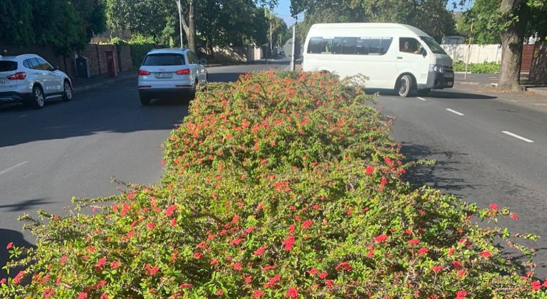 In Zuid-Afrika wordt de stekelige rijkelijk rood bloeiende plant nogal eens gebruikt als middenberm op stadswegen. Plotseling doorsteken naar de andere rijrichting wordt daarmee tegengegaan. Grotendeels tenminste want verlagingen van de haag op sommige plekken worden soms toegewezen aan onfortuinlijke koersveranderingen van een roekeloos busje. Een lekke band veroorzaakt door los geraakte stekels kan ook grote gevolgen hebben. Het is zo’n beetje als met de Meidoornstekels in onze streken in de fietsband.