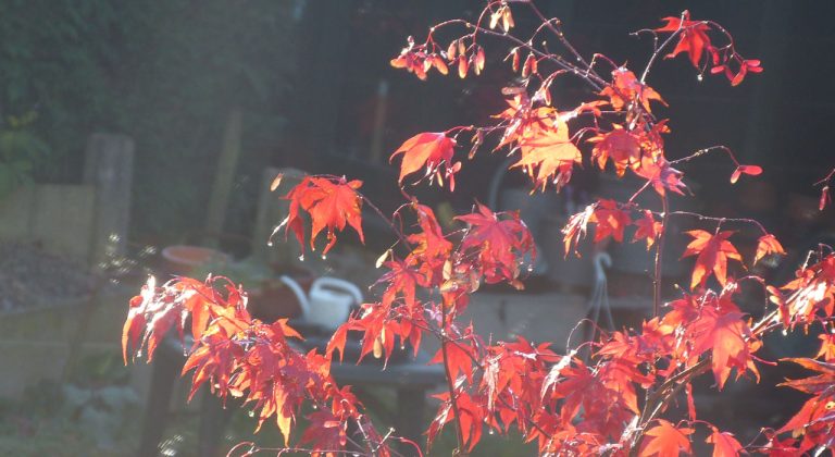 Twee graden Celsius onder nul en daardoor een wit mastiekdak bij het morgengloren. Dat betekent dus ook witte natuur rondom en daarmee zelfs witte natuur in de tuin. En inderdaad blijken de laatste series bladeren aan boom en struik met iets wittigs bedekt te zijn. Het grasveld vertoont het nog duidelijker en is niet groen maar grijsgroen door de bevroren dauwneerslag. Een beetje aangevroren vocht uit de atmosfeer. Autobezitters weten er van. Dat betekent “krabben”.