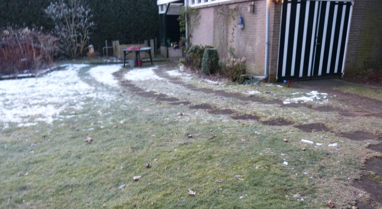 Maar nu de tuin met een grasveld op het zuiden. Aan de zijde waar het huis staat is dankzij de beschutting en de reflectie door de gevel de werking van de zonnestraling zo verhoogd dat de sneeuw gesmolten is. Een kleine zone die dankzij nabije begroeiing weinig zonnewarmte vangt is nog wit. Opmerkelijk daarbij is dat twee tegelpaden van een inrit ook voldoende warmte opnamen om de sneeuw te laten smelten. Een bezem kwam er niet aan te pas. Maar dan is er nog een derde boog gesmolten sneeuw links daarvan. Daar heeft tot voor enkele jaren een derde tegelpad gelegen. Na opruimen daarvan en opvullen met tuinaarde en gras inzaaien blijkt er toch nog een verschil in oppervlak te bestaan. De sneeuw is ook hier verdwenen. De toestand ter plaatse is duidelijk nog steeds anders dan in de naaste omgeving. Van dit verschijnsel maken archeologen graag gebruik bij hun zoektocht naar bijzondere vondsten. Luchtfotografie is hierbij een handig hulpmiddel. Een drone kan daarbij tegenwoordig goed helpen.