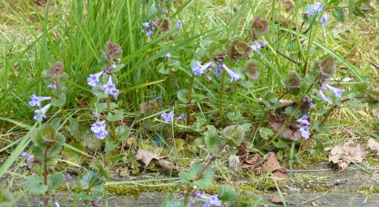 Nu, bijna een half jaar verder, is het duidelijk geworden dat het inderdaad de vestiging van de Hondsdraf (Glechoma hederacea) betrof. De plant heeft zich goed weten te handhaven en zelfs nog verder uit te breiden. De bloeitijd blijkt intussen aangebroken te zijn. Nu bevestigen de typische blauwe bloemen dat het om deze plantensoort gaat. Het klopt helemaal met de karakterisering als een “kruipende plant, vaak wortelend op de knopen met opstijgende bloeistengels met bleek violetblauwe lipbloemen en niervormige tot hartvormige bladeren”.