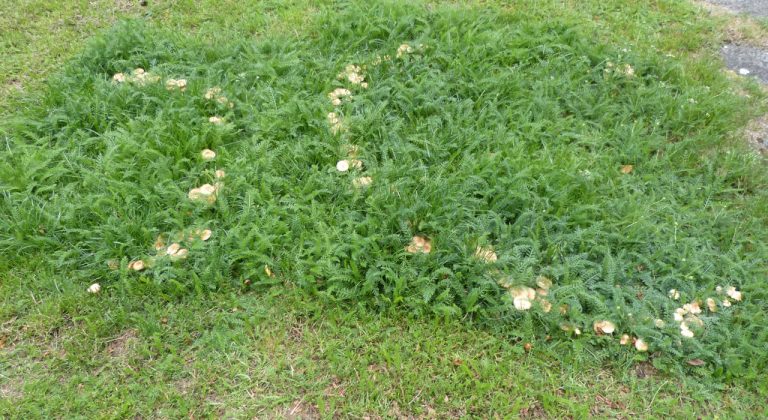 Hier is het duizendblad dus gebruikt als bodembedekkend middel. Hetgeen dan beloond wordt met het wederom verschijnen van een in eerdere jaren al optredende heksendansgroep. Een bijna complete 8-vormige dubbele ring van paddenstoelen van de Weidekringzwam (Marasmus oreades) was het gevolg. Die tot het Taailingen geslacht behorende kleine paddenstoel kan ook heel wat verdragen. De licht okerkleurige hoed is het dikste in het iets bolle centrum waar de rechte vrij dunne taaie ringloze steel zit. Een plaatjeszwam die in zomer en najaar kan verschijnen en jaarlijks kan terugkeren. Een taaie is het en tegen uitdrogen vrij goed bestand en daarom “Marasmus” genoemd want het Griekse “maraino” betekent “uitdrogen, verdorren en wegkwijnen”. Een andere eigenschap is vastgelegd in de soortnaam “oreades” dat “grensvormend” aangeeft. Dat houdt verband met het vormen van een buitenring van verdorring en een binnenveld van vergroening. Dit alles is mogelijk doordat de schimmeldraden -het mycelium- van de paddenstoelen chemische producten maken die invloed op de naaste omgeving hebben. Dat is ook nog altijd na honderden jaren te bewonderen bij de Engelse “Fairy rings” die in de omgeving van het prehistorische Stonehenge voorkomen.
