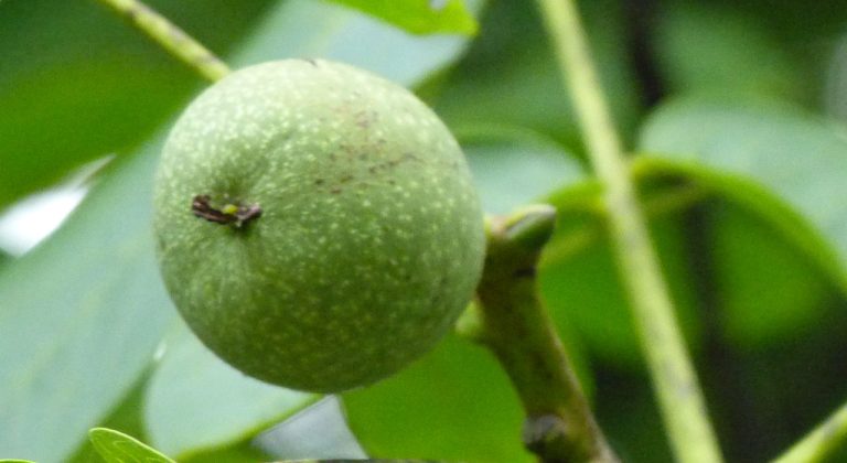 Kort geleden vond ik in de tuin op het grasveld een verse lege halve dop. Aan de blanke binnenzijde was nog het patroon te zien van een verdwenen walnoot. Een duidelijk teken van de aanwezigheid van een zorgzame eekhoorn. Zo nu en dan was er inderdaad een donker roodbruin exemplaar op verkenning voorbij gekomen. Alleen niet met een walnootbol in zijn bek. Toch is het wel eens voorgekomen dat de bijna dagelijkse eekhoorn met een bruine noot in zijn bek voorbijkwam. Niet met nog een bolster eromheen. Deze keer had hij haast en werd de bolster hier pas verwijderd.
