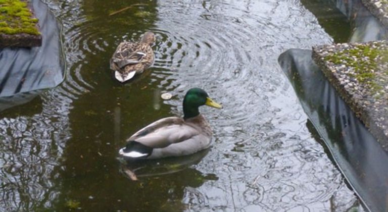 Ook dit voorjaar hebben we op zonnige dagen in het water gekeken of ze er al er waren. Tot nu toe echter tevergeefs. Nog te vroeg misschien. Maar vanmorgen kwam een bekend eendenkoppel zonder vaste woon- of verblijfplaats op bezoek. Lekker badderen in het vijvertje en wat grondelen ondertussen op zoek naar hapklaar voer. Wie schetst onze verbazing toen op een gegeven moment mevrouw eend in het plantenrijke wat verwaarloosde achterdeel van de vijver iets langwerpigs met geel/oranje kleur in de snavel had. Het ging wat moeilijk maar het lukte tenslotte wel om de salamander naar binnen te werken.