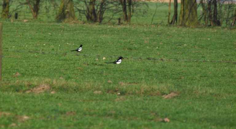 Al snel hadden rondzwervende vogels het ontdekt. Met als gevolg een viertal eksters bij de voedselbank. Interessant bleek toen wat deze eksters er mee gingen doen. Natuurlijk was mijn fototoestel niet direct bij de hand om dat vast te leggen. Hun aanpak was even anders dan verwacht. Ze aten het niet op maar propten de snavel er mee vol en vlogen naar begroeiing aan de rand van het gras om het daar tussen de planten te deponeren. En dat herhaalde malen en in alle richtingen. Reserve mondvoorraad her en der aanleggen dus. Een kaal gezocht grasveld achterlatend dat tenslotte door vuil dubbel glas gefotografeerd kon worden.