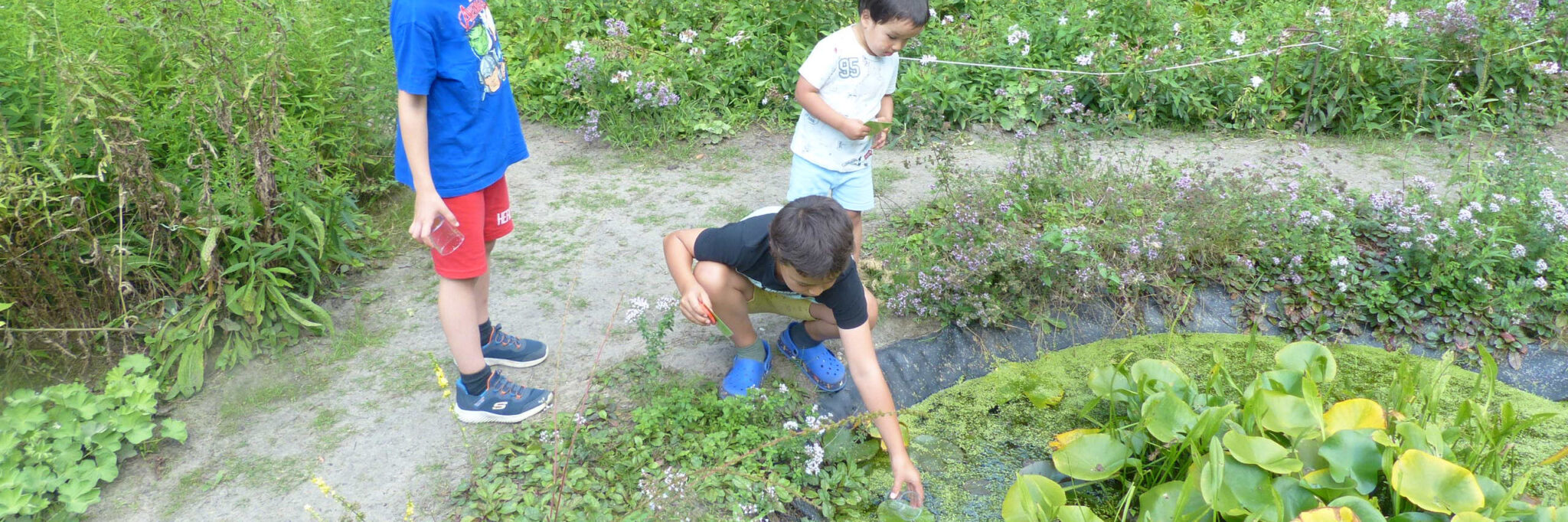 Toch willen er best wat kinderen met hun ouders naar de Vlindertuin. Het loopt gezellig door. En ook hier is water, met véél meer kikkers dan in het zwembad! Ze jagen braaf op de nepvlieg die voor hun neus bungelt en één kikker wil zelfs even in een loeppot om zich van dichtbij te laten bewonderen.