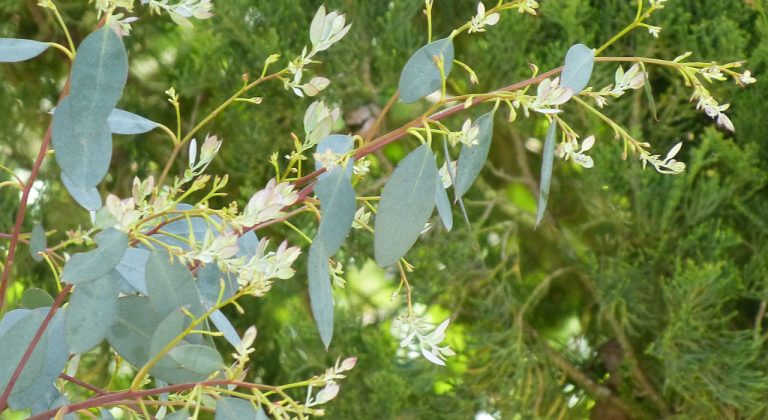 Maar witte borstelvormige pluizige bloemen worden hier toch niet gevormd. Dus ook geen “Eu-kaluptos” meeldraden die “goed met hoedjes bedekt” zijn. Er is ook geen ruime nectar gift. Dat kan dit lid van de Mirtefamilie met het bij kneuzing geurig blad hier in dit land toch niet opbrengen. Hooguit herinnert het gebruik van anti-hoest middelen en huishoud geurstoffen, die met aromatische olie versterkt zijn, ons aan de eucalyptusgeur. Bij koorts zal de “Koortsboom” ons toch niet helpen en bij verwonding van de stam zal uittredende gom hier de bijnaam “Gomboom” niet suggereren. Wel zal de opvallende “Azura” blauwe bladkleur het hele jaar door bij deze in Frankrijk tegenwoordig gekweekte matig vorstgevoelige boom/struik om aandacht blijven vragen. De twijgen krijgen soms een lichte blauwrode tint.