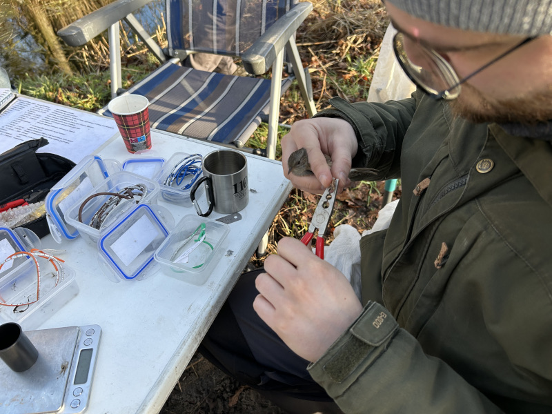 Maar het was niet de hoofdmoot van de excursie! Dat was een enorm interessant bezoek aan twee vogelringers op het landgoed. Vogels ringen mag je pas na een twee jaar durende opleiding. Zo wordt gewaarborgd dat de vogels zo stressloos mogelijk worden gevangen en professioneel worden geregistreerd.