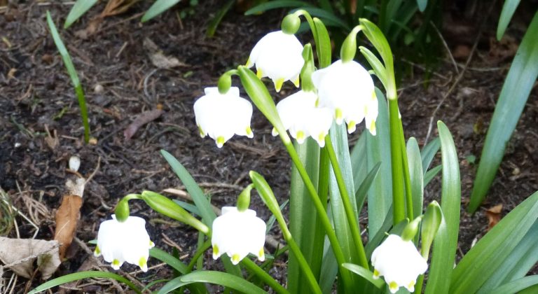 Een wat minder bekend voorjaarsbolgewas is het Lenteklokje (Leucojum vernum). Ook dit jaar waren er heel wat bloemen van te bewonderen. Bovendien was het natuurlijke verouderingsproces goed te volgen bij een paar planten die aan de grasgrens staan. Toen viel het op dat de vruchtbeginsels groter werden en vervolgens door hun toenemend gewicht de bloeistengels ombogen. Zo bereiken de zaaddozen de grond en openen de mogelijkheid van uitbreiding in de naaste en iets verdere omgeving. Uitbreiding van het woongebied dus.