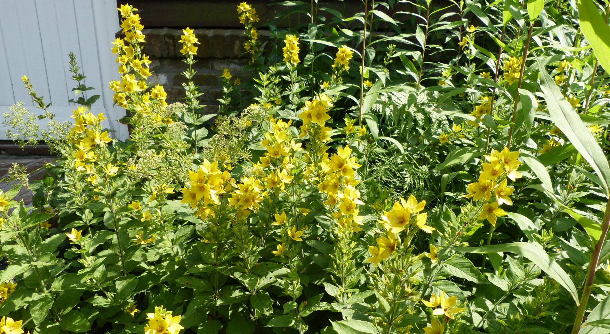 Die vraag eenmaal gesteld zijnde werd het tijd om eens poolshoogte ter plekke te gaan nemen. Nou, dat viel niet mee want al bij aankomst bij D’n Nieuwe Hof bleek dat alle plantengroei behoorlijk tot wasdom was gekomen. De eventueel aanwezige bordjes zouden dan wel aardig verstopt staan. Dat bleek inderdaad het geval hier en daar. Op een paar perken was net een flinke opruiming geweest met goed zichtbare bordjes erbij. In andere delen bleken ze bijna onvindbaar, hetgeen te verwachten viel dankzij vaak forse groei van de planten. Maar gelukkig was er de soms overdadige bloemenpracht die ondanks de extreme droogte van de lentemaand en daarna toch nog bezoekers en insecten verwelkomt.