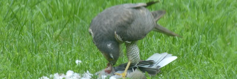Je weet het maar nooit als je op bezoek gaat. De natuur laat van alles gebeuren. Het is in dit geval dus duidelijk puur natuur zoals deze roofvogel, die tegenwoordig als stootvogel te boek staat, zich hier van zijn noodzakelijke maaltijd voorziet. En dat midden in de bebouwde kom op een tuingrasmat. Een kwestie van aanpassen dus.