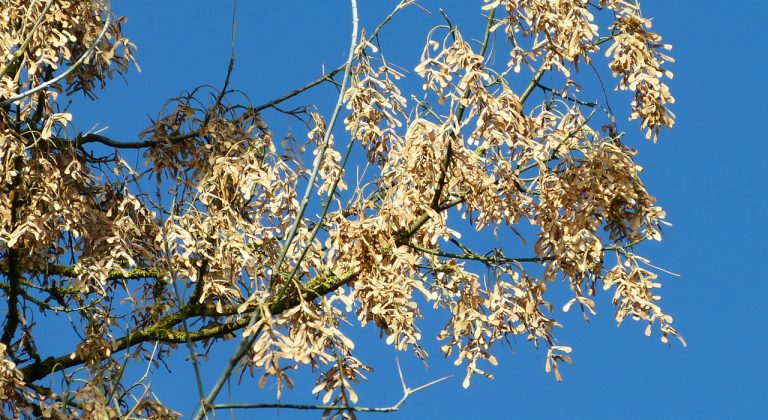 Planten en ook bomen kunnen soms rekening houden met de toestand van de omgeving. Kunnen nu de vruchten los gelaten worden of is even afwachten misschien beter. Voorbeelden hiervan zijn overal om ons heen te ontdekken. Lang niet alle zaaddozen van planten zijn al helemaal geleegd. Ook de “neusjes” van gewone esdoorns blijven voor een deel nog even hangen. De Japanse esdoorn cultuurvorm met rood blad en bast laat dat hier duidelijk zien. Een week later was alles weggevlogen met de hulp van de vleugel. Soms enkel en soms dubbel hangend en bijna altijd enkel in de vlucht. De andere vederesdoorn cultuurvorm met bruingroene bast houdt de bossen vruchten nog veel langer vast. Zo nu en dan worden er een aantal afgerukt door een windvlaag maar de gevleugelde zaden kunnen hier vaak nog lang blijven hangen. Ook de besvruchten (met “neusjes”) van de meidoorn in de heemtuinhaag achter het IVN-gebouw blijven soms lang hangen voordat ze door vogels naar elders getransporteerd worden.