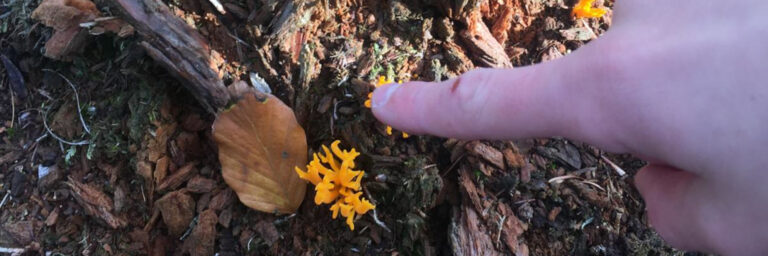De erg korte wandeling duurde gemakkelijk twee uur omdat er zoveel gevonden en gedeeld werd over de wonderlijke paddenstoelenwereld. Vanuit de bosjes werd met enige regelmaat de hele groep bijeengeroepen om bijzonderheden te bewonderen zoals de neonoranjegekleurde koraalzwam, witte oorzwammetjes, een flinke doolhofzwam, een mosdekentje versierd met melksteelmycena, en een dennenappel met muizenstaartzwammetjes. Ondanks het vele ruiken bleef de stinkzwam echter verborgen. Maar we hebben veel gelachen en bewonderd.
