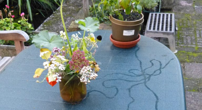 Op een vochtige morgen in begin oktober bleek de tuintafel bezoek gehad te hebben van een slak. Of meerdere slakken misschien. Bij het nalopen van de donkere slijmsporen komen er namelijk verschillende mogelijkheden tevoorschijn. Alle wegen leiden naar bloemenvaas en pot. Dat was dus wel het doel van de tocht. En alle wegen beginnen of eindigen aan de rand van de tafel. Er is geen slak meer te zien. Ook niet in de vaas of pot. Waar is het dier vandaan gekomen? En hoe is het op het tafelblad beland? Om de rand soms? Maar dan moet het dier een heel eind ondersteboven aan de onderkant van het tafelblad voortgekropen zijn met een start van de kruispoot af in het midden van de tafel. Of zat de slak al langer in pot of vaas en leidde de tocht tenslotte over de tafelrand?