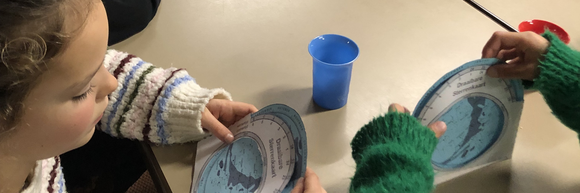 Emile was, zoals altijd, weer helemaal gericht op de vragen van de kinderen. Hij wist het op een boeiende manier uit te leggen. Er werd gestoeid met dag en nacht, seizoenen, stand van maan en zon, sterrenbeelden en planeten. Met een schaar en plakband maakten de kinderen zelf een draaibare sterrenkaart. Om zo deze maand en tijd met op dit moment het heelal met de sterren te kunnen zien.