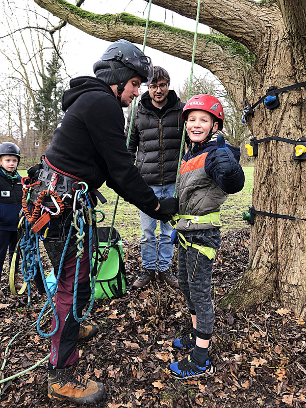 - Klimmen in bomen. De vleugelnootboom heeft duidelijk de voorkeur. Groot met veel vertakkingen. Gezekerd in een gordel en met hulp van David gaan ze allemaal een keer letterlijk de boom in. Op het hoogste punt even roepen en zwaaien naar iedereen om vervolgens weer naar beneden af te zeilen!! Op de begane grond weer aangeland wordt iedereen beloond met een lolly.