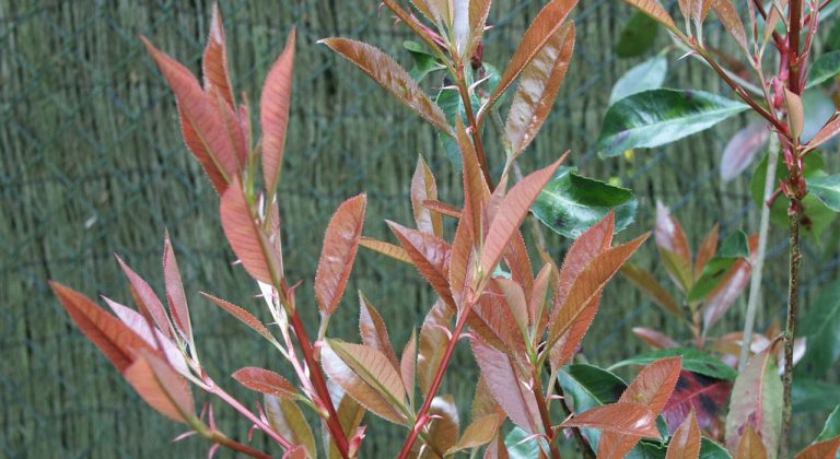 Een heel duidelijk voorbeeld van bladverkleuring is te zien bij de Photinia heester. Daar is dan bovendien nog een extraatje waar te nemen omdat de ontwikkeling van nieuw en het afstoten van oud blad tegelijk plaats vindt. Dieprode kleuren (anthocyaan) komen dan tevoorschijn waar in de zomertijd weinig anders dan tinten groen de overhand hebben en de rode kleur verbergen. Zo is vooral bij deze struik gemakkelijk de jaarlijkse opeenvolging van het uiterlijk bepalende inwendige processen te volgen.
