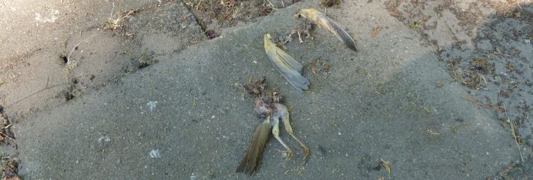 Een korte tijd later werd op een tegelpad een nog vrij compleet pakket veren en botten van een vogel aangetroffen. Alle vleesdelen waren vakkundig verwijderd. De al jaren in de nabije boomtoppen nestelende ekster zal er toch niets mee te maken hebben?