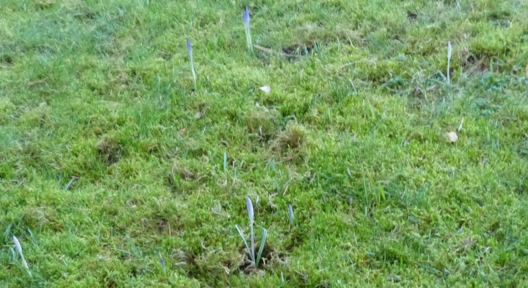 Op 13 januari 2018 waren ze duidelijk te zien. De vroegste lucifers hadden zich al enkele dagen eerder vertoond. Maar nu was het duidelijk dat de echte durfals zich kwamen presenteren. De vroege vogels onder de boerenkrokussen (Crocus tommasinianus) in het mos- en grasgazon. Net in het groen rechtop staande ouderwetse lucifers. Op het eerste gezicht helemaal kaal. Maar bij nader aanzien toch wel vergezeld van twee tegenoverstaande dunne sprieten die later tot echte bladeren moeten uitgroeien. Er zit zelfs al enige blauwkleuring in de wat verdikte spoelvormige top van de bloem. De rest is een witte steel. Dat zal nog moeten uitgroeien tot een volwassen exemplaar als tenminste voordien geen kwade krachten de plant in wording vernietigd zullen hebben. En dat gebeurt nogal eens zodat maar een beperkt percentage van deze vroegelingen de volwassen leeftijd met volledige uitgroei zal kunnen halen.