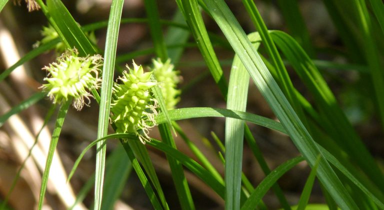 Een tot de Cypergrassen behorende zegge – mogelijk Blaaszegge – laat de geelgroene vrouwelijke aren goed zien. De stampers staan nog mooi op de urntjes. De aparte manlijke bruine lange aar is ook te zien bovenaan.
