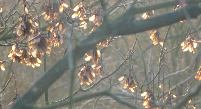 Een andere mogelijkheid voor winterlicht is een alleen bij heel laag staande morgenzon waarneembaar verschijnsel dat juist na Kerstmis zich voordeed. Een boom met flink gespreide takken vertoonde een massa winterlichtjes. Het duurde maar kort maar net lang genoeg voor een paar haastige foto opnames. Bij wat uitvergroting werd het duidelijk. Trosjes gevleugelde vruchten van een suikeresdoorn blijven altijd nog lang in de wintertijd hangen en vingen hier het bijna horizontaal schijnende morgenlicht korte tijd op.