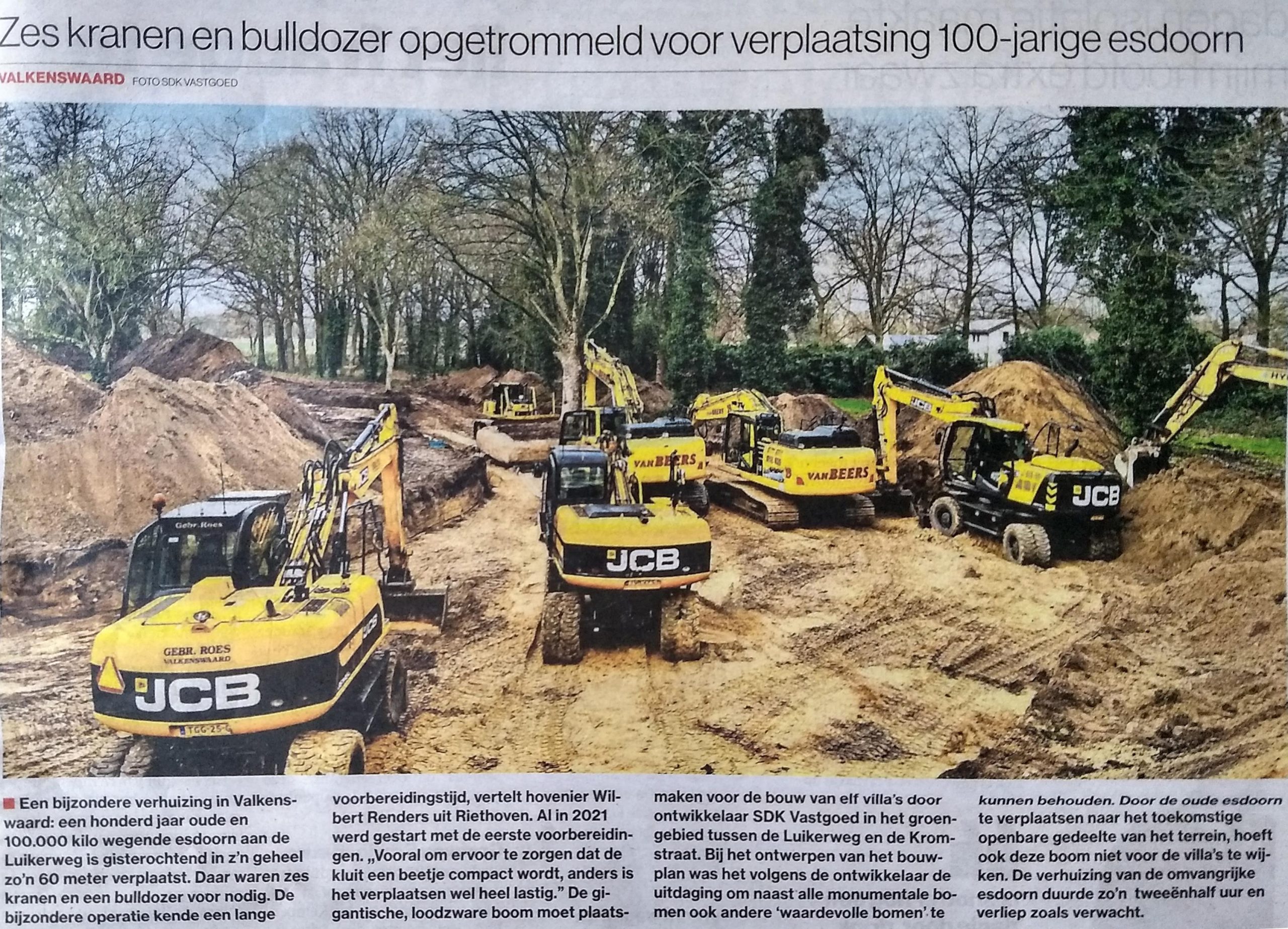 Dus de zaag erin? Soms gaat het gelukkig anders. Na jaren van voorbereiding is op 24 februari in Valkenswaard een esdoorn 60 meter verplaatst. De waardevolle boom van ca. 100 jaar oud bevindt zich nu op een plek waar hij enkele nieuw te bouwen woningen niet meer in de weg staat. De toekomstige bewoners mazzelen maar: zo is de omgeving meteen al prachtig aangekleed.