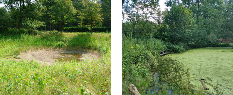 Meteen in 2018 bewees het werk zijn waarde! In de kurkdroge zomer van 2018 bleef toch een restje water achter. De salamanderlarven die in een ‘bijpoeltje’ waren achtergebleven, hebben we met de hand overgezet. Sindsdien is het vaker lang droog geweest en is de poel toch in geen enkel jaar helemaal uitgedroogd.