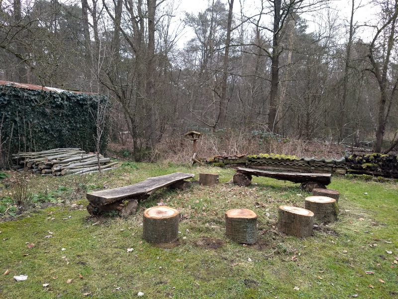 De nieuwe boombanken worden bijgeschaafd en -geschuurd. Klaar om binnenkort in de olie te worden gezet. En verder kunnen we harken, harken, harken. Dankzij de vorst raken ook de eiken – met hun notoire late rui – al aardig leeg.