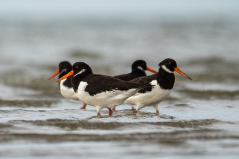 Vier scholeksters staan in ondiep water met hun kenmerkende oranje snavels.