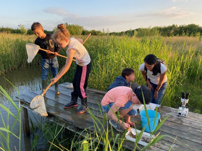 Met schepnetten, witte bakken, loeppotjes en zoekkaarten worden waterbeestjes geschept, onder de loep genomen en onderzocht wat het is. Onder water leven heel veel beestjes die je zo op het eerste oog niet ziet, zoals waterkevers, bootsmannetjes (ruggezwemmers), watermijten, eenoogkreeftjes, waterschorpioenen, kokerjuffers, larven van libelles en waterjuffers. Er gaat een wereld voor je open als je de vangst bekijkt. We maken drie groepen en we gaan op drie waterlocaties scheppen. Tussendoor nemen we het trekpontje en lopen we door het voedselbos.