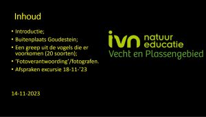 Ook de vogelgeluiden kwamen aan de orde en dat was best handig bij de excursie in Goudestein. Helaas was het erg regenachtig maar toch hebben we aardig wat vogels weten te spotten vooral op basis van het geluid. Waarschijnlijk gaan we in het voorjaar een vergelijkbare excursie doen want met de opgedane kennis willen we natuurlijk aan de slag gaan.