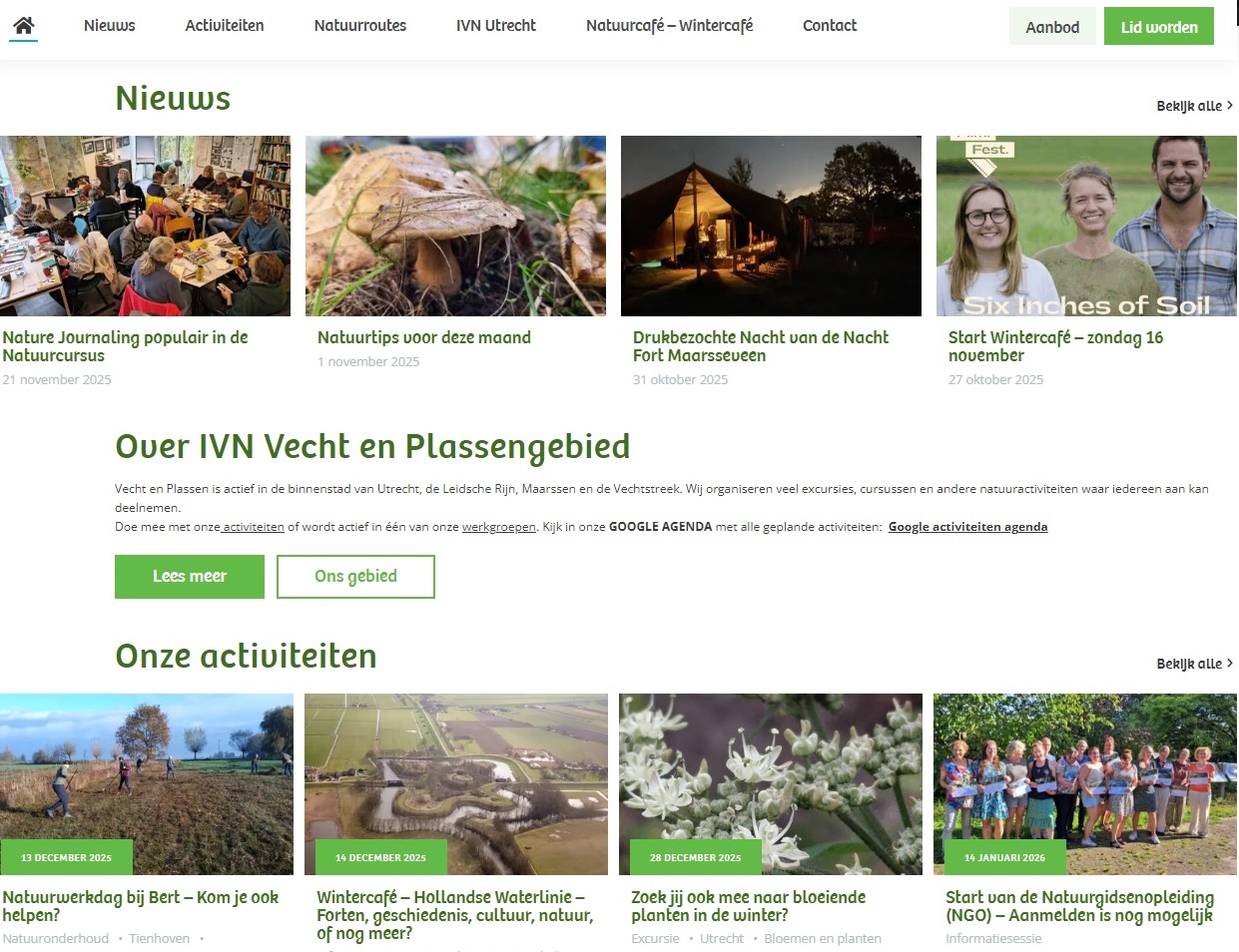 IVN Vecht en Plassengebied is een actieve natuurvereniging met ongeveer 80 enthousiaste vrijwilligers. We werken in verschillende werkgroepen en organiseren een breed scala aan activiteiten – neem eens een kijkje op onze Verenigingsagenda! Nieuwe initiatieven zoals ons Natuurcafé, samenwerkingen met organisaties zoals het Streekmuseum, en het opleiden van nieuwe gidsen zorgen ervoor dat er altijd wat te beleven valt bij ons.