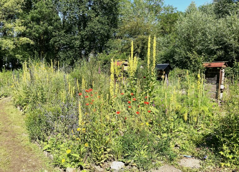 Het streven is om een variatie van nectarbloemen, liefst inheems, en waardplanten voor diverse vlindersoorten hier te laten groeien en bloeien. De bijenflats bieden nestgelegenheid aan solitaire bijen en wespen. De waarnemingen worden door een aantal leden van de werkgroep bijgehouden, zodat wij weten welke bijen en wespen hier voorkomen. Op de foto hier middenonder een graafwesp, de gewone vliegendoder, ofwel mellinus arvensis.